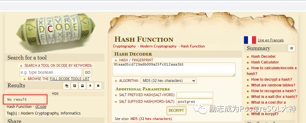 但您可以想象,超级管理员的slat总是postgres,因此仍然有可能被破解。在网络上,我们发现了一种破解的网站,尝试未能成功。