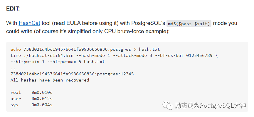 我自己下了hashcat,总是试验不成功。因此破译密码的之路从入门到放弃了。在PostgreSQL10之后,推荐使用scram-sha-256加密算法进行加密。