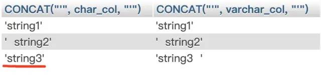 得出来的结果如下,可以看到 CHAR 类型的 string3后面的空格被移除了,而 VARCHAR类型的没有。这种情况大多数时候不会有什么问题,实际在应用中也经常会使用 trim 函数移除两端的空字符,但是如果确实需要存储空格的时候,那就需要注意不要选择使用 CHAR 类型: