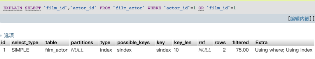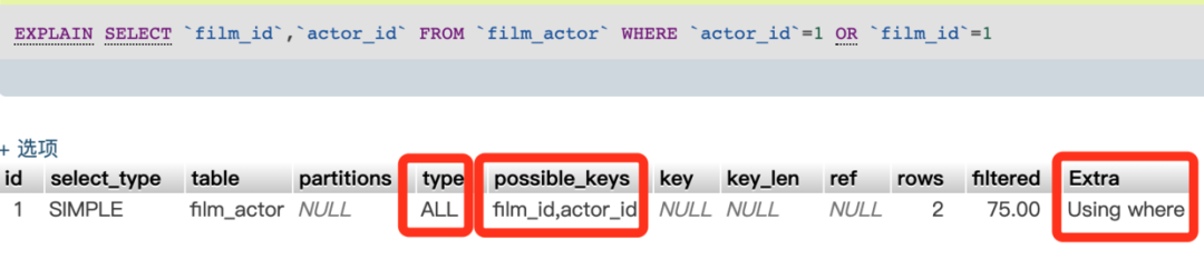 EXPLAIN SELECT `film_id`,`actor_id` FROM `film_actor` WHERE `actor_id`=1 OR `film_id`=1