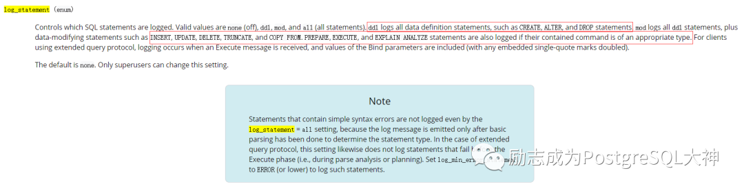 控制,它有4个选项:none、ddl、mod、all。一般建议开启ddl,它会记录 create、alter和drop相关的语句,但不记录truncate。truncate在文档中属于 mod。这倒是让我有点惊讶。稍后我查了下stackoverflow