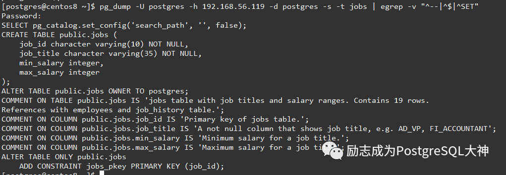 [postgres@centos8 ~]$ pg_dump -U postgres -h 192.168.56.119 -d postgres -s -t jobs | egrep -v "^--|^$|^SET"