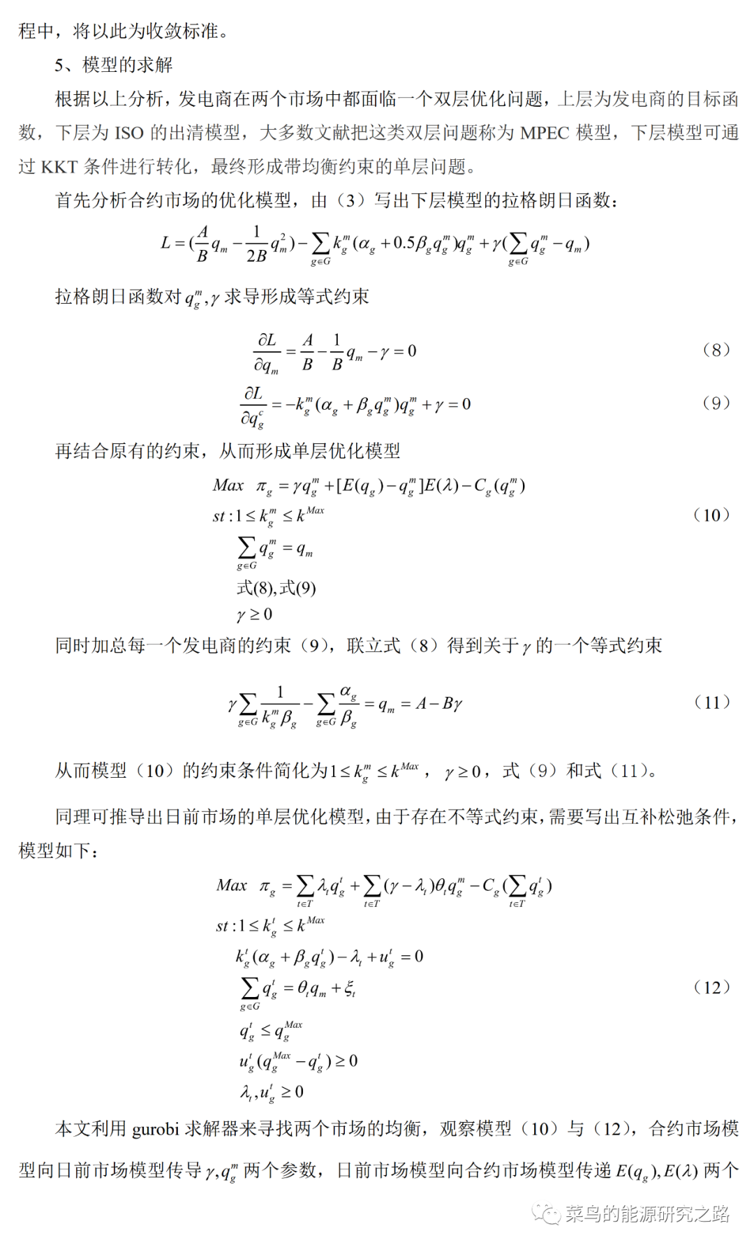 由于电力需求的弹性太小,所以可以假定市场需求曲线为固定的,(即:负荷侧的报价曲线固定),也就可以只考虑发电商的报价策略。那么,发电商的策略选择是建立在交易所出清结果的基础上,所以在两个市场中,发电商面临的都为一个双层模型,模型上层是发电商的目标函数(利润最大化),下层为ISO的出清模型(大多文献称为MPEC模型),下层模型可通过KKT条件进行转化,最终形成一个带均衡约束的非线性规划问题。