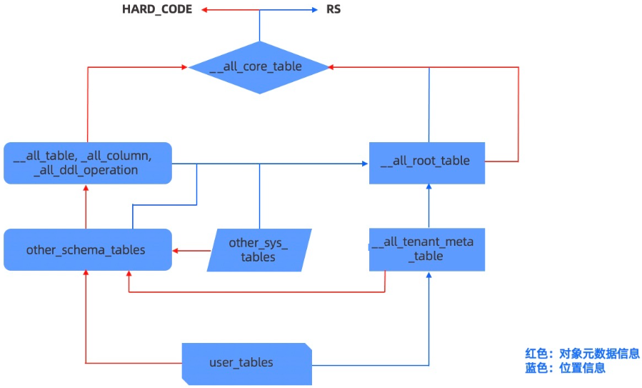 例如,租户下的 __all_table 表存储了本集群下所有的用户表的信息,租户下的 __all_table 表的对象元数据信息是直接引用了系统租户的 __all_table 表,而系统租户的 __all_table 表的对象元数据信息是存储在 __all_core_table 表中,__all_core_table 的表结构为硬编码。