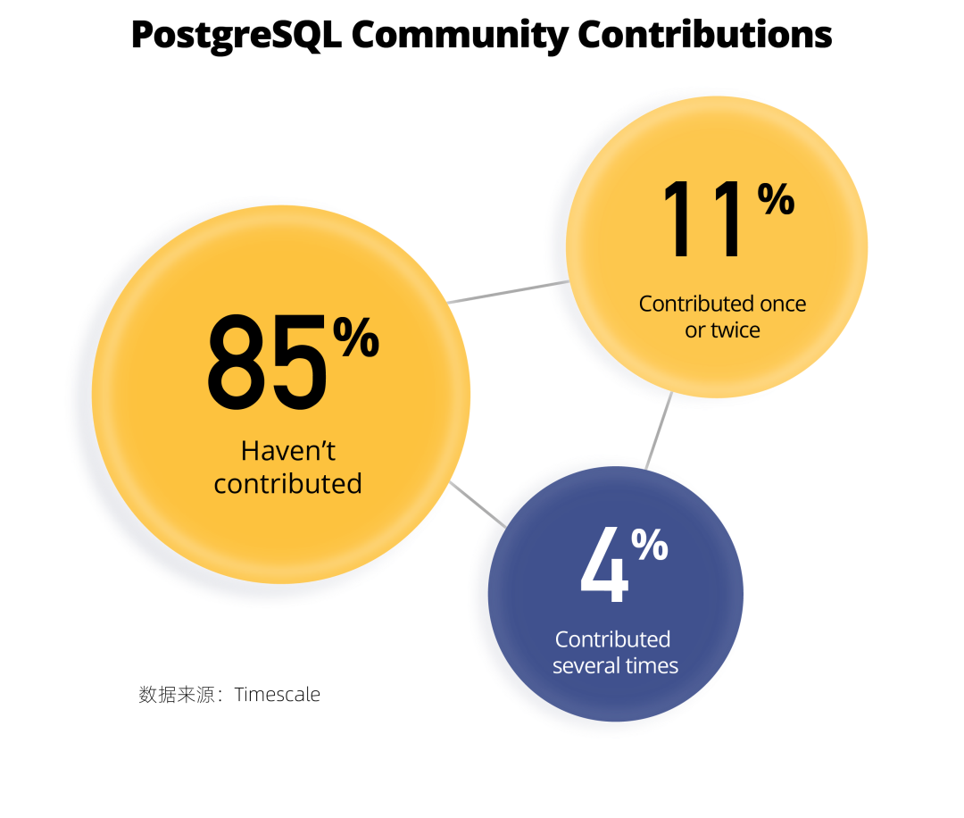 PostgreSQL全球的Committer人数长期维持较少的数目(约20+人),全球主要Contributor名单中,也很难见到国人的身影。2021年PostgreSQL现状调查数据显示,85%的受访者从未为PostgreSQL代码库、文档或提交做过贡献,只有4%的受访者曾贡献过几次。而 OpenPie 的研发团队中,有众多工程师均参与过PostgreSQL的代码贡献,且贡献代码数量可观。