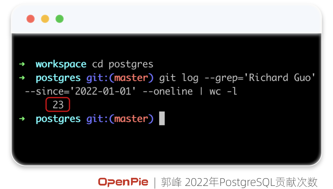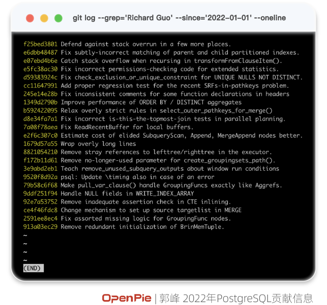 OpenPie “开放创新”的企业文化吸引了众多热爱技术、和开源文化的工程师的加入。其中,多名同事在PostgreSQL 11、 12、13、14以及即将发布的15版本中均有代码贡献。值得一提的是:2022年,OpenPie研发团队郭峰 (Richard Guo) 参与贡献PostgreSQL代码已达23次,其中包括7个Review Commits,2个Report Commits,14个Author Commits。