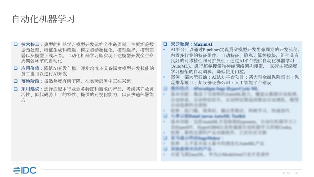 IDC发布的《中国人工智能与大数据技术现状及趋势分析,2022》报告,在自动化机器学习技术/热点上,天云数据MaximAI属于递增型。递增型这种新一代技术显著改进了现有的技术类别,以交付更好的业务成果。就业务流程而言,该技术提供了超越当前最佳实践的渐进式但可测量的改进。