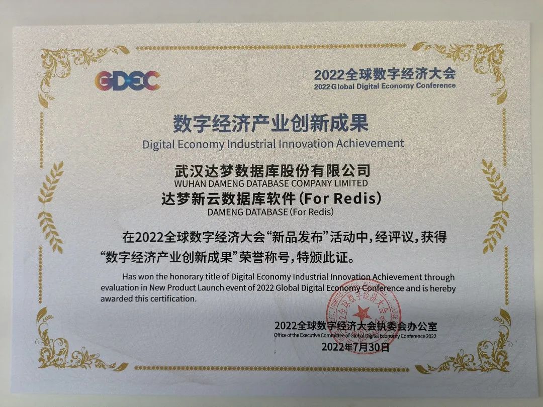 2022全球数字经济大会成果发布会已在国家会议中心成功召开。本次发布会由2022全球数字经济大会组委会主办,北京市经济和信息化局、朝阳区人民政府、中国通信企业协会、中国信息通信研究院共同承办。大会首次举办数字经济新品成果征集评选和发布活动,共有国内15个省市、数百家企业参与申报,经过严格的评议筛选,武汉达梦数据库股份有限公司(简称:达梦数据)新产品达梦新云数据库软件(For Redis)荣获“数字经济产业创新成果”!