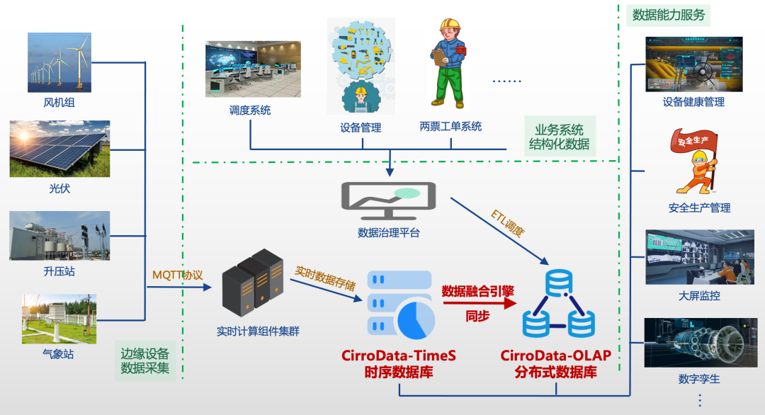 平台接入区域场站数十万测点秒级运行数据,将采集到的多个场站的风电机组、光伏逆变器数据、升压站数据和气象数据通过专用通道,实时存入CirroData-TimeS时序数据库;业务系统的结构化数据通过数据治理平台ETL调度进入CirroData-OLAP分布式数据库进行存储。