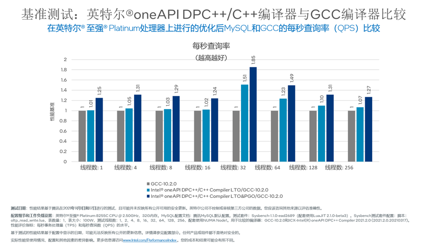 腾讯云数据库MySQL的优化结果说明了使用英特尔oneAPI DPC++/C++编译器等最新开发工具和基于英特尔VTune测评器的最新优化技术的重要价值。性能方面的显著改善可以提高关键业务应用(business-critical applications)产生结果的效率或数量。