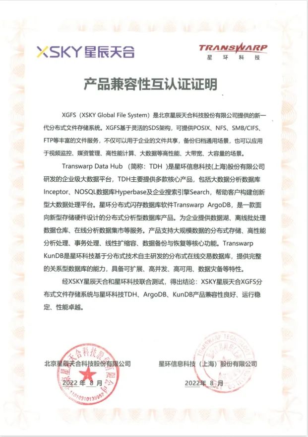 近日,北京星辰天合科技股份有限公司(简称:XSKY星辰天合)的 XGFS 产品完成了与星环信息科技(上海)股份有限公司(简称:星环科技)的 TDH、ArgoDB、KunDB 等产品的互认证,共同推出大数据存算分离联合解决方案(简称:联合解决方案)。