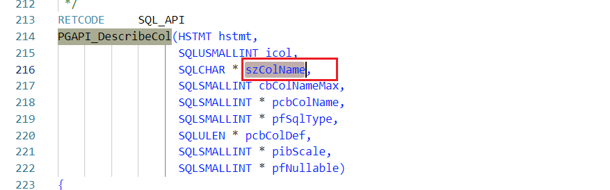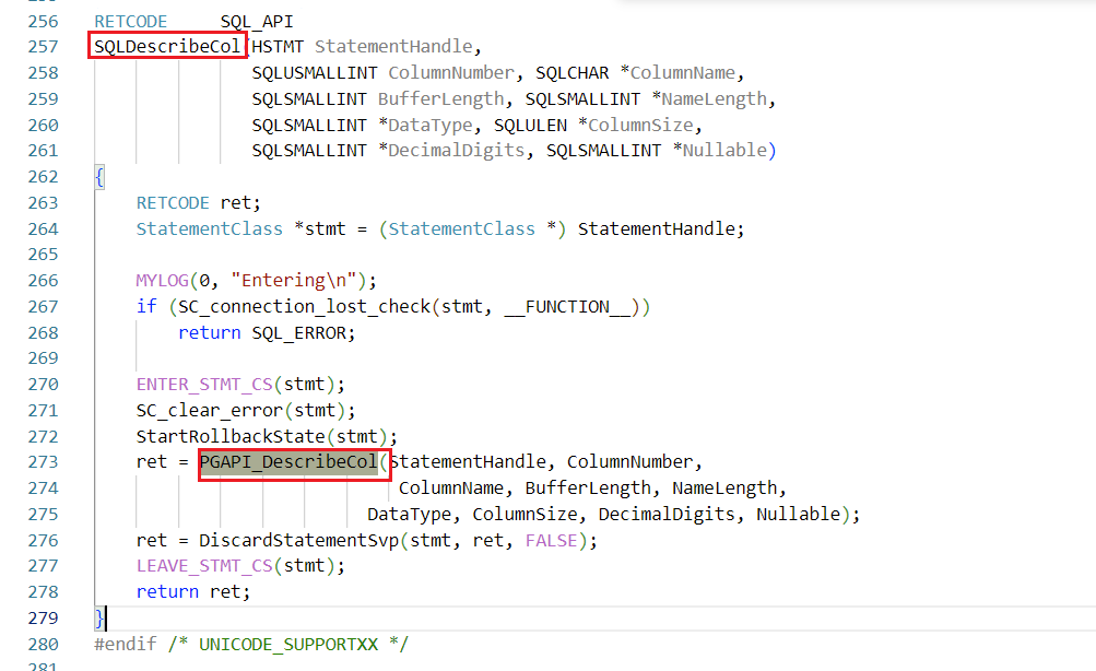 根据这个函数hgodscr_process_sellist_description 的名称猜测,大概率是调用ODBC的 SQLDecribeCol函数。而SQLDecribeCol在OG ODBC里对应的是PGAPI_DecribeCol