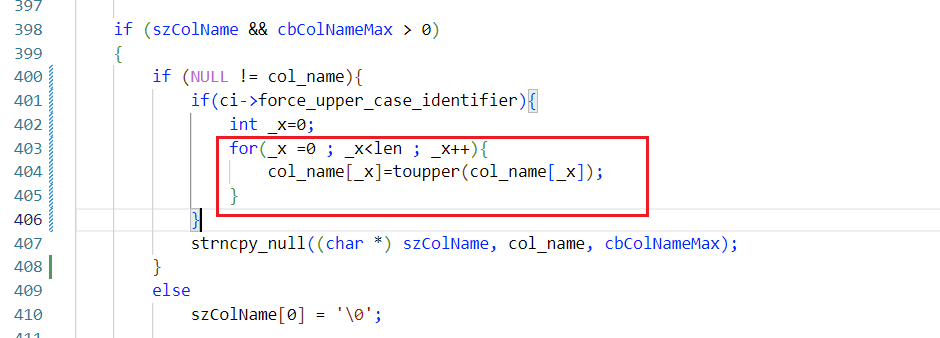 考虑到不能变动默认行为,新增了一个ODBC参数ForceUpperCaseIdentifier及变量force_upper_case_identifier,只有变量force_upper_case_identifier为真时,才会做这个动作,也就是说,如果不是特意修改force_upper_case_identifier这个变量,行为上和以前表现一样。