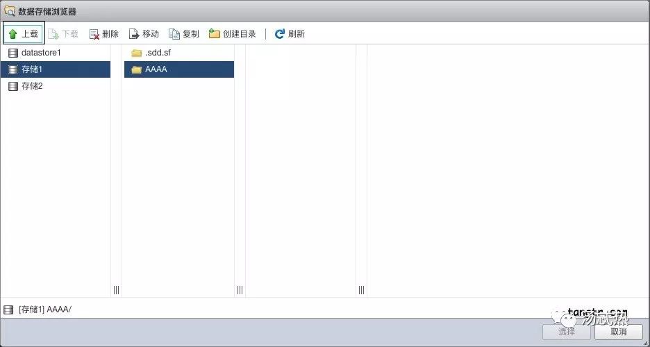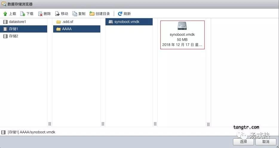 7.选择一个位置,点击上传,把网盘里里下载的synoboot-flat.vmdk和synoboot.vmdk两个文件上传进去,最后选择synoboot.vmdk文件。