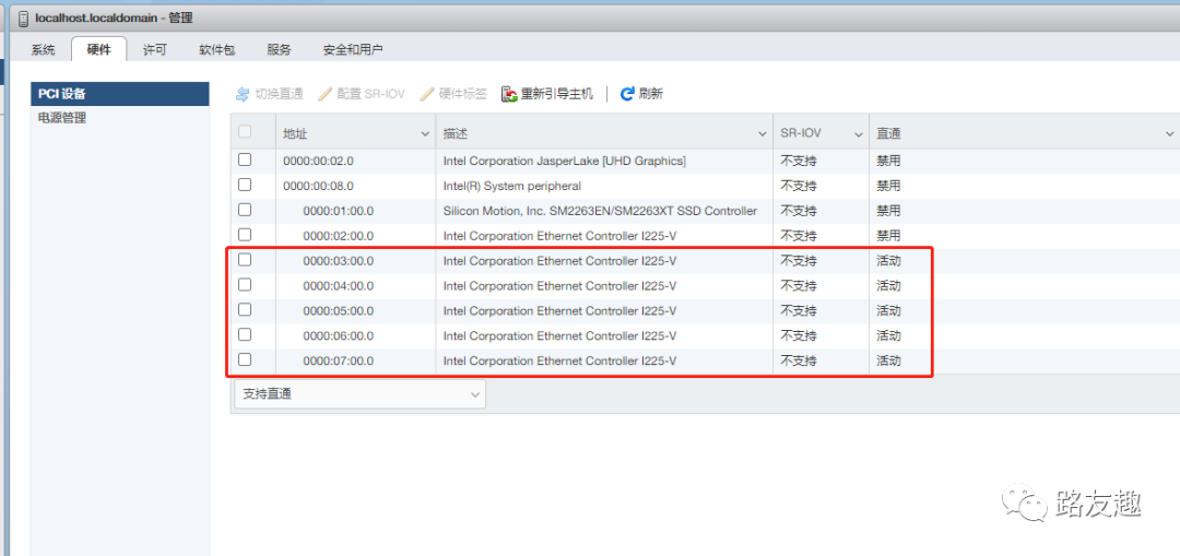 由于02 网卡 管理口是不能直通,所以直通网卡只能直通框选中的那5个PCIE网卡至于01 这个是M.2固态硬盘,这个除非把ESXI装在SATA硬盘上,否则千万别直通。