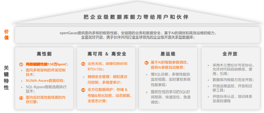 性能、全链路的业务和数据安全、基于AI的调优和高效运维的能力。openGauss全面友好开放,