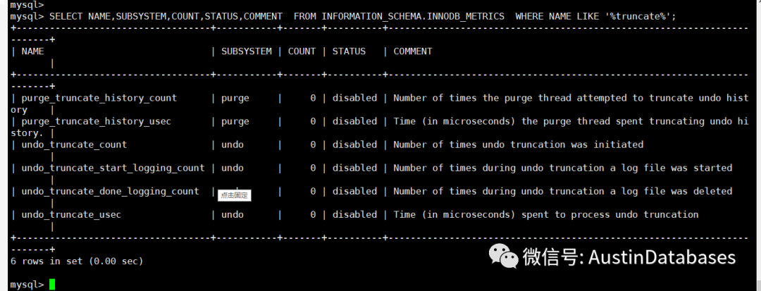 通过上面的语句可以查看当前的 undo log truncate的情况,如 已经进行了多少次的 truncate ,以及工作的时间等等 。