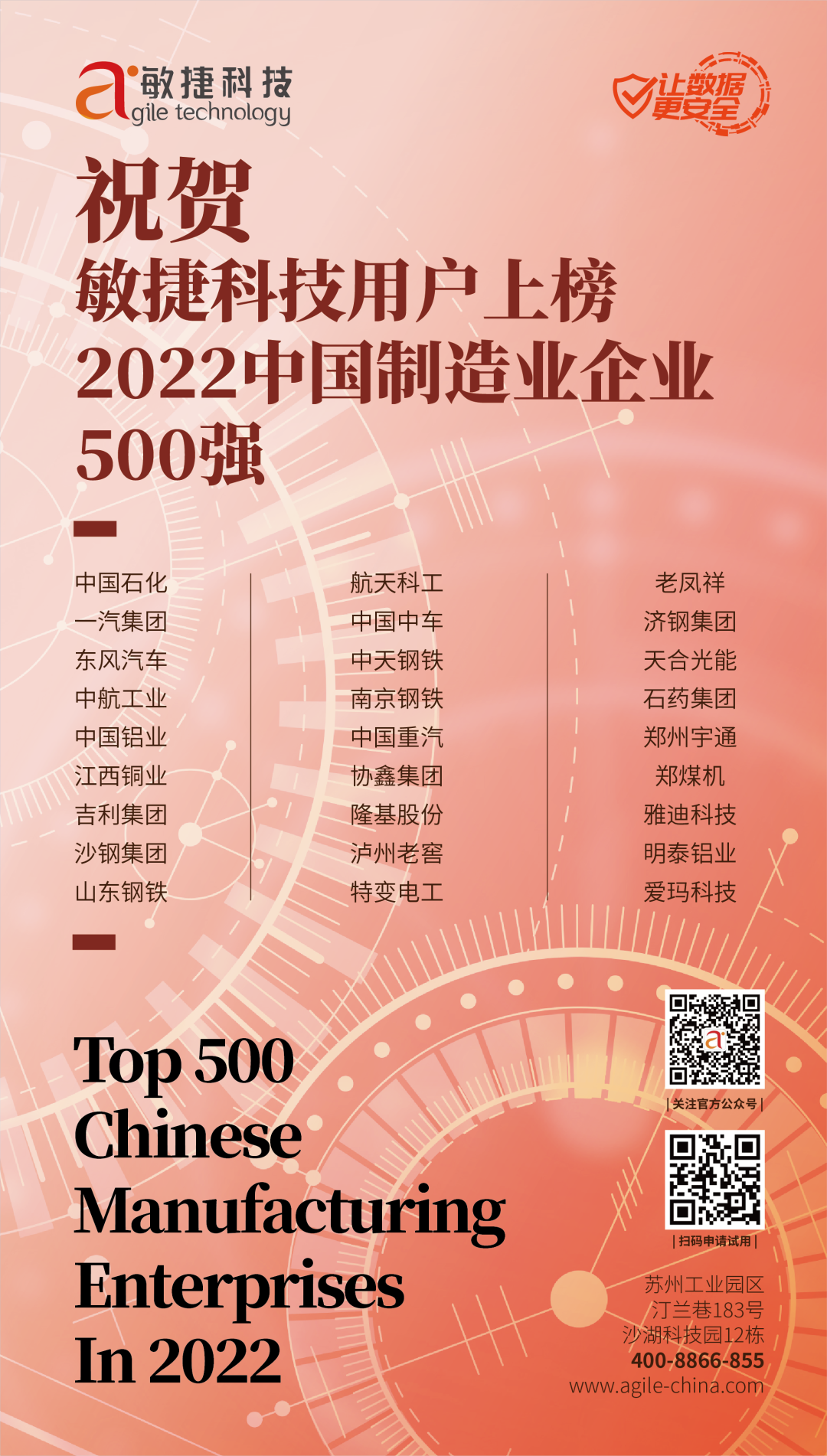 9月6日,中国企业联合会、中国企业家协会(以下简称中国企联)在京发布“2022中国制造业企业500强”榜单,敏捷科技护航的包括中石化、一汽、东风、中车、吉利、南钢、沙钢等多家行业标杆客户强势上榜!