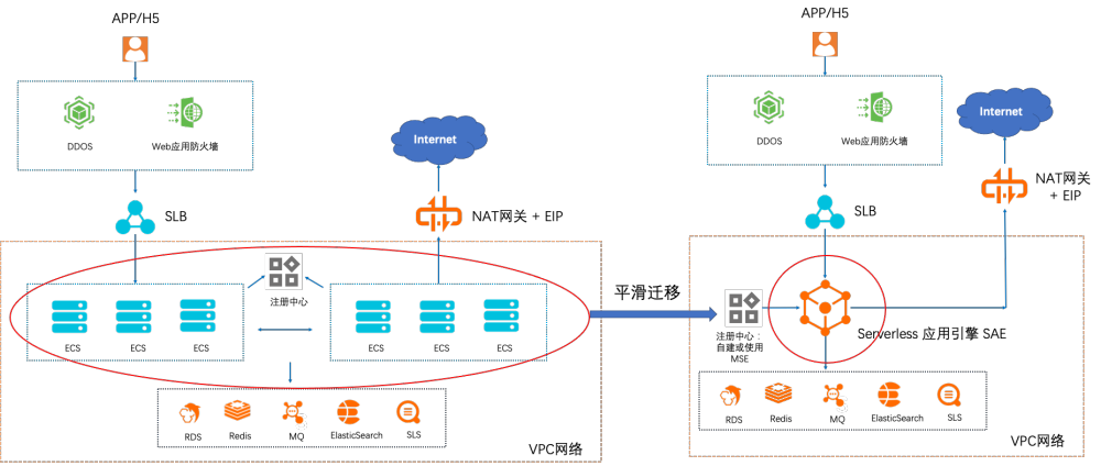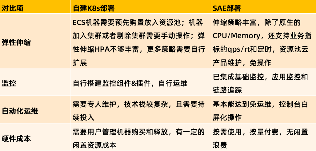 在新架构的设计上,针对当前遇到的痛点问题,项目组在技术选型时定下了以下几个目标:1. 自动化运维,团队需求多,开发任务重,专门负责运维的同学并不多,希望 2.0 系统可以借助体系化的运维平台,提升运维效率,大幅减轻运维压力。2. 自动弹缩,团队的业务活动较多,活动到来时有不可预知的流量波峰,之前通过预估扩容的方式存在预估不准和扩展困难的问题,2.0 系统希望可以更加简单的扩缩系统,最好能够通过自动化的方式避免重复的部署和下线操作。3. 版本管理,测试环境并不能完全模拟线上生产环境,新上线的组件上线后可能会出现问题,希望能够有版本管理的工具,当遇到问题时,可以很方便的切换到指定版本,实现代码资产的可选管理。4. 团队协同,目前团队协作主要靠人为线下沟通,不同团队的组件都由自己维护,ECS 机器彼此也都权限隔离,2.0 版本希望可以使用统一的系统管理权限,实现不同团队,不同角色都可以使用同一套权限体系,简化团队之间协同的工作。5. 监控平台,目前的系统缺少监控,于实时运行状态监控几乎没有,目前只有基于机器运行指标的监控。各组件按照开发人员设计自行打日志,当出现问题时,排查问题链路冗长,且没法做到统一的链路追踪。由于系统缺少量化指标,对系统的把控性偏低,没法做到异常预警,也没法很好的做针对性的持续优化。2.0 系统希望在这方面有所改观,能多维度的对系统进行监控,增强对系统的控制力。为此,项目组在阿里云上进行了第一轮全面筛选,很快选型目标缩小到了自建 K8s 和 SAE,并对这两种技术进行了一系列的比对,主要比对指标如下:对比这两种技术后,考虑到自建 K8s 本身的复杂性,对技术栈的深度,技术的持续投入和业务的收益,项目组进行了多方面衡量,最终选择了 SAE。SAE 这款产品在免运维,自动弹缩,可观测等方面都深度符合酒店集团当前项目的需求,项目组在最初选型时就对以下几个功能非常感兴趣:免运维:SAE 能够免运维底层基础设施,例如 IaaS、K8s、微服务组件和 APM 组件等,无需自建 ZooKeeper、Eureka、Consul 和 Skywalking 等,极大降低开发运维成本。提供商业化稳定性兜底。自动弹缩:SAE 提供了精准容量+弹性+限流降级一整套高可用产品化解决方案。通过该方案,SAE 能够帮助应用轻松应对流量高峰,在保证业务 SLA 的同时也节省了资源成本。体系化监控:SAE 无缝集成的 ARMS 产品,具有白屏化应用监控和诊断能力,可用定位到慢 SQL、慢方法、方法的调用堆栈、对于线上问题的分析、排查、预警和解决,提供强有力支持,节省大量的排查时间。在项目组确定选型之后,项目组很快开始着手迁移系统到 SAE,迁移的过程比原计划的更加顺利,由于一开始设计集团的系统时便是基于微服务理念的,所以 ECS 上的组件迁移到 SAE 能够做到很顺滑,代码层面没有大的改动,迁移过程见下图:随着迁移工作的进行,项目组对 SAE 有了深入的了解,项目组又发现了更多贴合业务的功能点,具体表现:对 CICD 的支持:SAE 支持云效、Jenkins、源代码、Cloud Toolkit 插件、容器镜像服务等多种部署方式,自动完成从代码提交到应用和任务部署的 DevOps 完整流程,高效替代业内部署复杂、迭代缓慢的传统方式,实现了高效的持续交付流程。高可用和稳定性的支持:SAE 支持批量发布,微服务无损上下线,使组件在发布更新时,不会影响影响整体链路的可用性,另外 SAE 还支持多可用区的部署,使得应用的稳定性得到进一步的加强。权限助手:权限助手可以对 SAE 的权限进行可视化配置,精确到应用、任务的读写操作,并在 SAE 控制台生成对应的权限语句,避免因直接在 RAM 控制台手动编辑权限语句而出现纰漏。操作审计:SAE 记录了所有应用及资源相关的操作详情,包括操作时间、操作内容、操作人 ID 等信息,在出现问题时可以快速追溯原因。结合这些 SAE 的能力,本次信息平台 2.0 的建设,项目组没有大的改造原来代码逻辑的同时,基本完成了最初定下的目标,同时在开发,运维和协作的几个方面建设了自己的流程规范,快速追平了业内的优秀实践。项目组最终在 2022 年 2 月份完成了整体的迁移,新系统上线后,通过 SAE 白屏化的操作界面,运维难度和压力都大大降低。根据 rt 和定时的混合策略,应用有了很好的弹缩表现,并且这一切都是自动化的,不再需要运维同学人为的介入,这一点大大的降低了重复劳动。在团队协作方面,通过阿里云的 RAM 体系,开发,测试,运维同学都统一在 SAE 控制台各司其职,减少了很多不必要的沟通消耗。总体来看,系统上线 SAE 之后,开发运效率提升了 50%+,机器成本下降了 20%,运维人力成本下降了 60%,扩容速度更是比之前快了十几倍,很好的完成了之前定下的目标。第一期上线后,项目组计划信息平台还会有更多的技术优化点,其中有些 SAE 目前还有所欠缺,后面还需要与SAE团队共同探讨解决:- 对多语言的支持:目前系统基于.net 框架 C#语言,SAE 的微服务治理和链路追踪没有很好的支持,这方面需要加强建设。