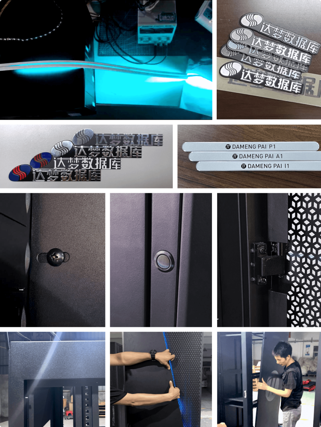 每一个细节,都精心打磨。在整个柜体设计中,正面顶部的达梦 LOGO 和腰间的产品铭牌,是展现品牌归属感的重心。在确定达梦 LOGO 牌的效果时,我们对“铝冲压高光”、“电镀镍”、“磨具凹凸”等十多种工艺进行打样对比,最终找到满意的“压铸铝合金-氧化后上色”工艺;而腰部的铝合金产品铭牌,为黑色机身带来点睛之笔,通过 CNC 精加工雕刻工艺,实现细节处的极致质感。