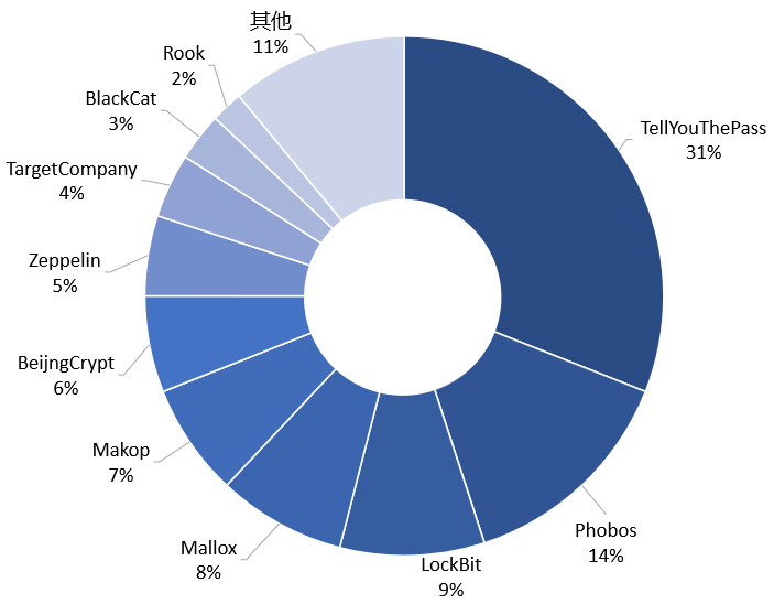 下图是美创安全实验室对勒索病毒监测后所计算出的8月份勒索病毒家族流行度占比分布图。TellYouThePass勒索家族出现新的变种且异常活跃,占比31%居首位,其次是占比14%的Phobos家族,Lockbit家族以9%位居第三。