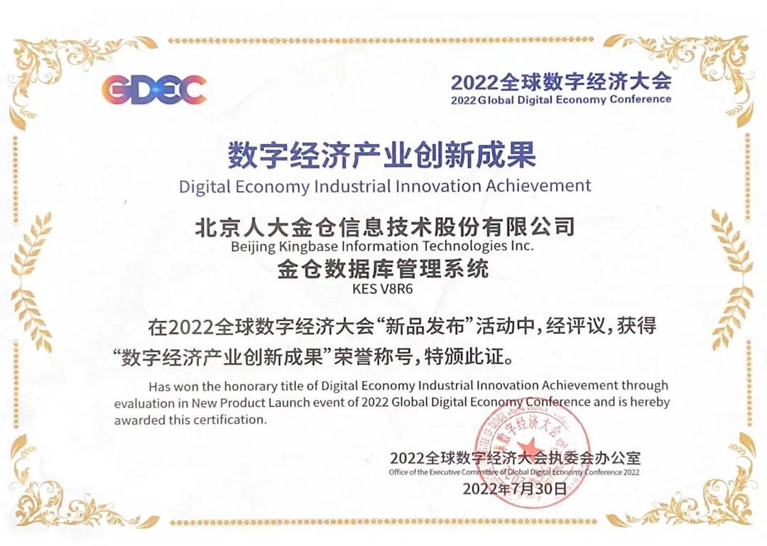 近日,人大金仓核心产品KES荣获2022年全球数字经济大会“数字经济产业创新成果”奖。