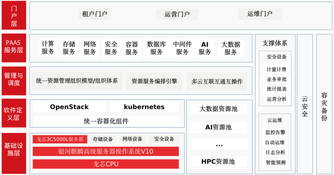 银河麒麟高级服务器操作系统底层架构具有可靠性、安全性、高性能和可扩展性,对云平台提供稳定支持。