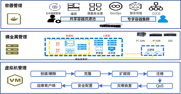 在资源管理应用场景中,方案支持单集群2000+节点,采用虚拟机与物理机多资源支撑容器服务,可按需创建共享与专享容器集群,并提供50+虚拟机生命周期管理功能。同时,方案实现了多租户网络隔离及挂载IP-SAN/FC-SAN云硬盘,实现硬件收集、系统安装、RAID/Bond配置、监控等任务功能,并支持自定义脚本,单主机多网卡绑定不同的安全组;在功能方面,方案的标签管理、批量操作、网络策略模板、C/S运维客户端等为用户提供了方便快捷的管理手段。