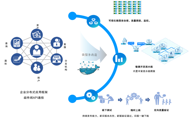 敏捷开发应用场景中,方案基于代码源自动完成代码编译、镜像构建、灰度发布、容器化部署流程,对接已有CI/CD,完成传统应用的容器化改造和部署,实现了一站式容器化交付。方案实现各个微服务实例的自动化注册和发现,构建微服务度量能力,支持微服务的健康度分析、故障定界定位、容量规划、根因分析、趋势预测等,同时,方案支持服务限流、降级、容错、弹性伸缩、安全管控等管控手段,通过应急预案、故障演练、混沌工程等稳定性能力建设提升线上微服务的可靠性,通过整体的全容器化架构设计,在敏捷开发场景中任务调度更灵活,执行效率更高。