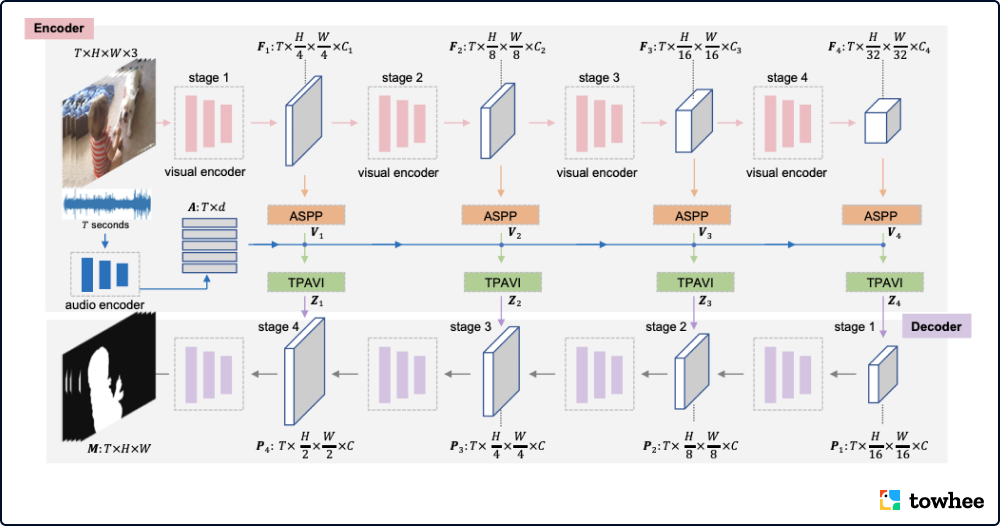 AVS 使用了一种层次编解码的结构。编码器将视频帧以及整段的音频作为输入,输出视觉和音频的特征。每一个阶段的视觉特征图之后送入了 ASPP 模块,然后传递到 TPAVI 模块。ASPP 为模型提供了不同的感受野去识别物体,TPAVI 则专注于时序的像素级别的音频-视觉交互。解码器逐步的扩大特征图最后生成掩码。模型训练过程中,AVS 设计并使用了一种正则化损失函数,用于提供音频-视觉的映射。