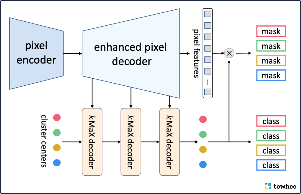 kMaX-DeepLab 主要由三个组件构成,包含像素编码器、增强像素编码器、kMaX 解码器。像素编码器可以使用任意的 CNN 或者 ViT backbone 来提取视觉特征,增强像素编码器负责将得到的特征图进行上采样恢复到输入图像的高分辨率,同时根据 transformer 编码器计算自注意力特征,最后 kMaX 解码器从 k-means 聚类的角度将目标 query 向量(或者理解为聚类中心)转换为 mask 嵌入向量。