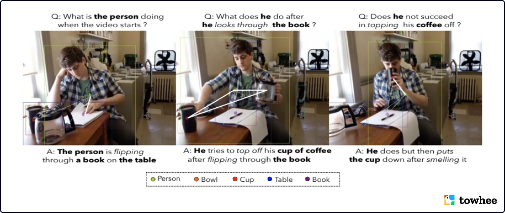 COST 首先将视频中的动态时空视觉内容解析为对象轨迹。在此基础上,框架会维护和跟踪与对象相关的对话状态,这些状态会在收到新问题时更新。这种对象交互是针对每个问题推断出来的,这个过程是动态并有条件的,形成了互相之间关系推理的基础。COST 还会保留答案的历史记录,这能够在之后的问答中检索以对象为中心的相关信息,以丰富答案形成的过程。然后,框架会考虑当前话语、现有对话、当前问题的上下文,逐步生成自然语言形式的答案。