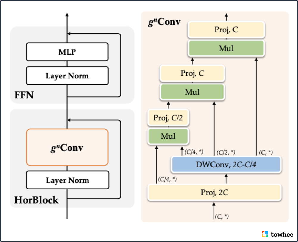 HorNet 展示了视觉 Transformer 背后的关键要素,即输入自适应、远程和高阶空间交互,也可以通过基于卷积的框架有效实现。该结构具有高度的灵活性和可定制性,兼容各种卷积变体,并将自注意力中的二阶交互扩展到任意阶,却不会引入大量额外的计算。它提出了递归门控卷积 (g^n Conv),通过门控卷积和递归设计执行高效、可扩展和平移等变的高阶空间交互。