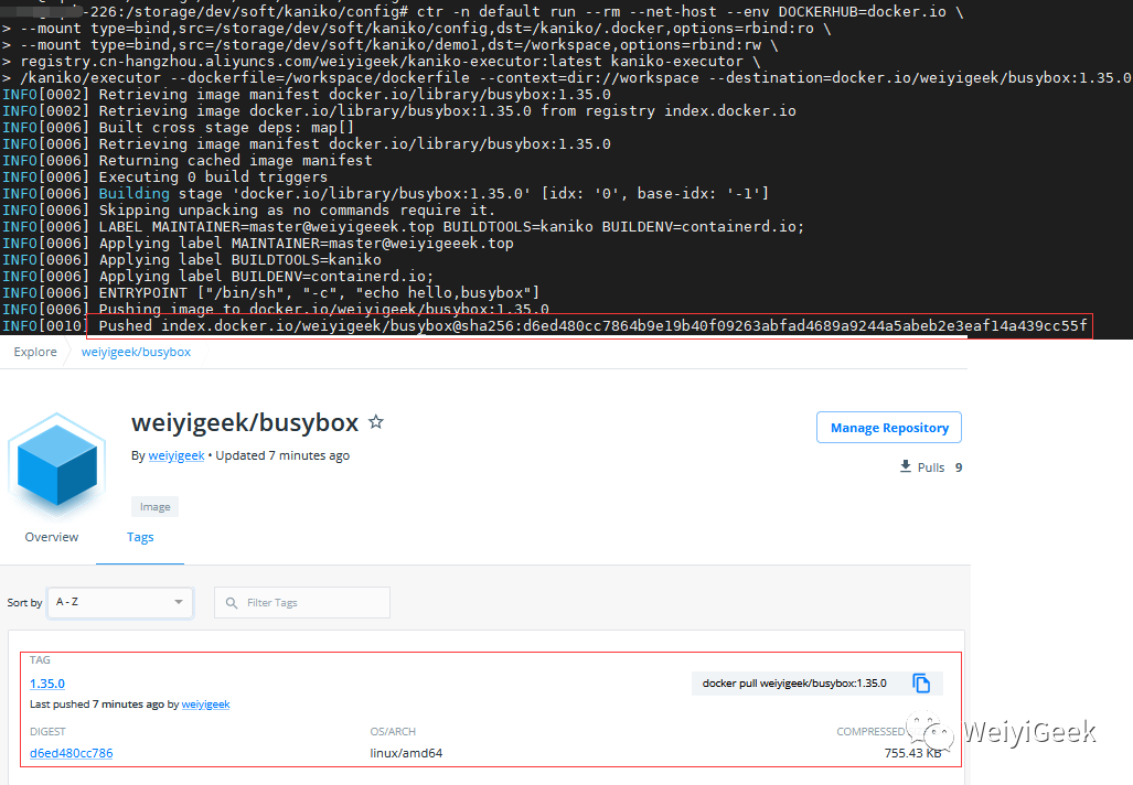 INFO[0010] Pushed index.docker.io/weiyigeek/busybox@sha256:d6ed480cc7864b9e19b40f09263abfad4689a9244a5abeb2e3eaf14a439cc55f