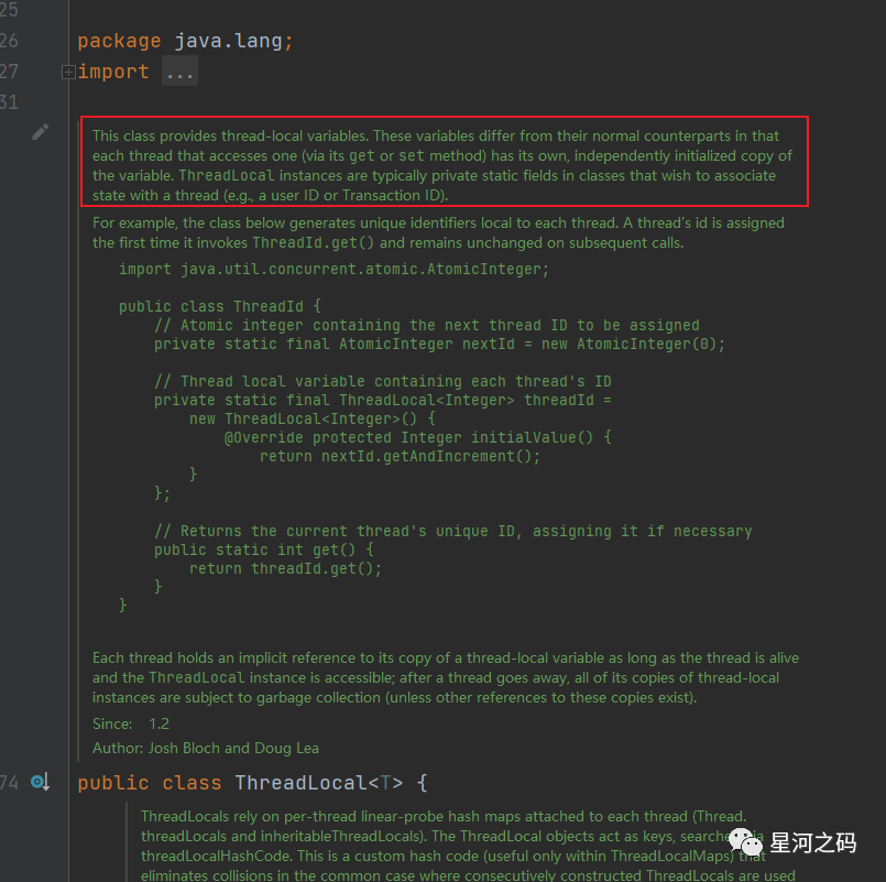 「ThreadLocal叫做线程变量,即ThreadLocal中填充的变量属于当前线程,该变量是当前线程独有的变量,对其他线程而言是隔离的」。