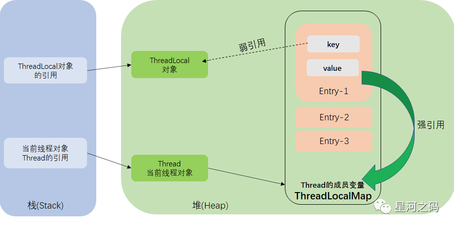 通过前面的介绍,我们知道「每个Thread都会维护一个ThreadLocal.ThreadLocalMap的map对象,这个map的key为ThreadLocal实例,并且是一个弱引用,而弱引用有利于GC回收」。