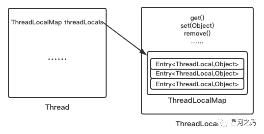 「当线程使用threadlocal 时,是将threadlocal当做当前线程thread的属性ThreadLocalMap 中的一个Entry的key值,而Entry的value值(实际要使用的变量值)是实际上存放的变量」。