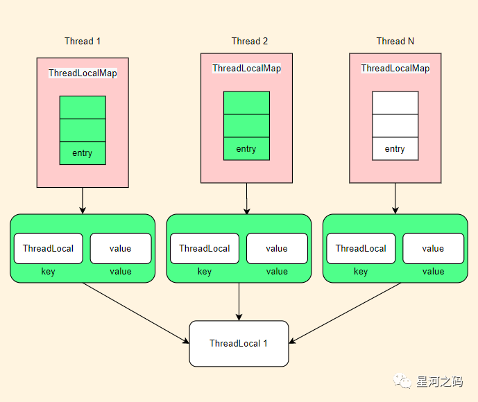 在一个线程里面可以有一个或者多个ThreadLocal的,这些ThreadLocal会被存放在ThreadLocalMap中