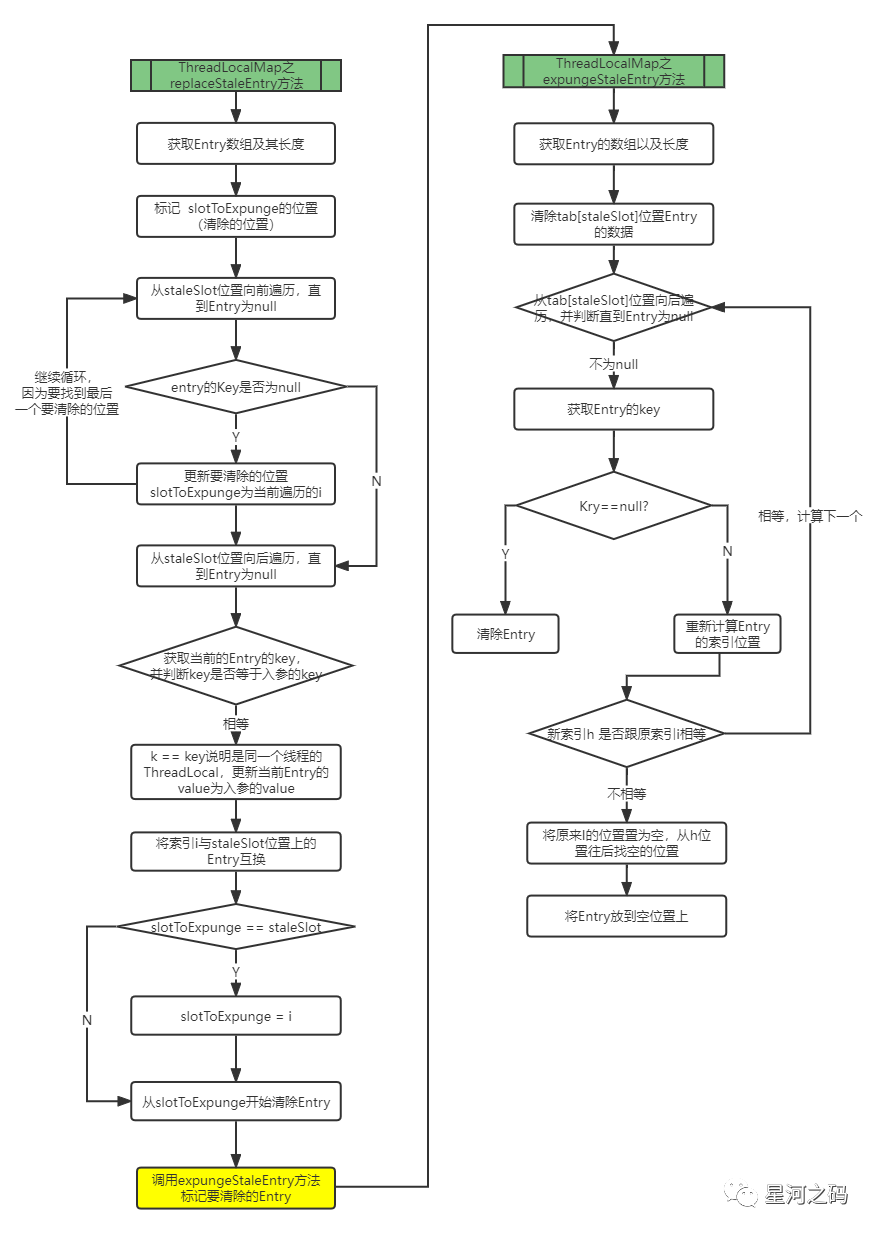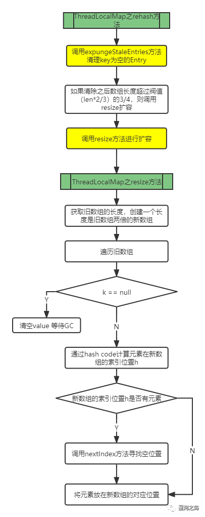 「ThreadLocal的set方法没有获取到ThreadLocalMap会调用ThreadLocal的createMap进行创建」 「获取到ThreadLocalMap,则会调用ThreadLocalMap的set方法」 「ThreadLocalMap的set方法时,遍历Entry数组,如果没有找到对应的key,则新建一个Entry放入数组中并且调用ThreadLocalMap的rehash进行扩容」 「如果找到entry的key为null则调用ThreadLocalMap的replaceStaleEntry方法对数组进行整理,标记要清除的Entry」 「ThreadLocalMap的expungeStaleEntry方法整理后调用ThreadLocalMap的expungeStaleEntry方法执行清除」 「ThreadLocalMap的rehash方法在扩容之前会先调用ThreadLocalMap的expungeStaleEntries方法清理key为空的Entry」 「清理之后判断数组长度是否大于阈值的3/4,超过则调用ThreadLocalMap之resize方法执行扩容」