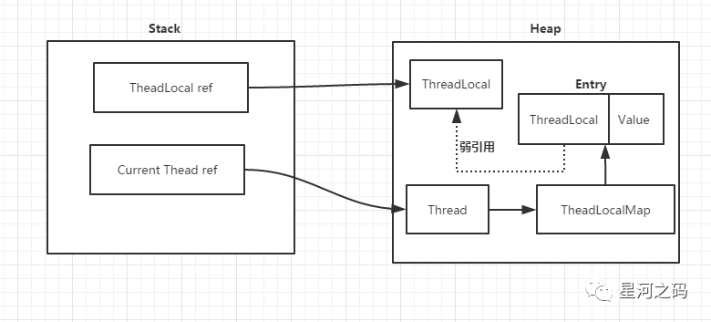 Current Thread Ref -> Thread -> ThreaLocalMap -> Entry -> value