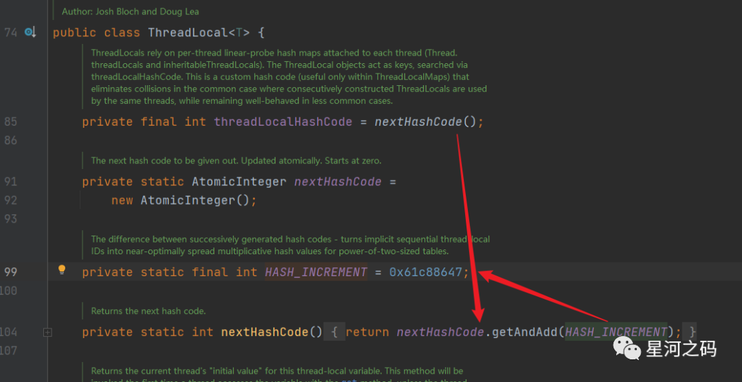同过源码发现,「每次获取threadLocalHashCode是通过一个个AtomicInteger类型的当前值加上HASH_INCREMENT(0x61c88647),而HASH_INCREMENT = 0x61c88647满足斐波那契数列(黄金分割数),其主要目的就是为了让哈希码能均匀的分布在2的n次方的数组里, 尽量避免hash冲突,这是也是Entry[]的初始容量为16的原因之一」。