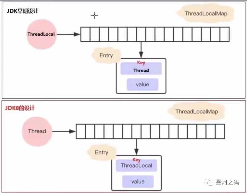 通过这种图可以看出来,「JDK8之前就是用Thread作为ThreadLocalMap的key,而JDK8改成ThreadLocal作为Key」,为什么这么改呢?