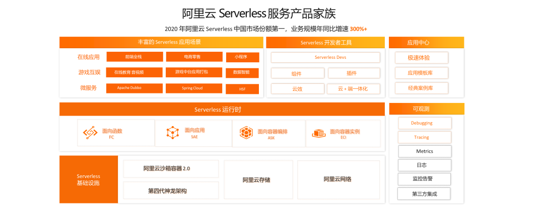《The Forrester Wave™: Function-As-A-Service Platforms, Q1 2021》报告The Forrester Wave™ 首次升级,评测标准更苛刻。作为业界公认最严苛的厂商综合能力评估模型之一,Forrester Wave 报告在全球范围内受到高度认可。本次发布的《The Forrester Wave™: Function-As-A-Service Platforms, Q1 2021》是去年《The Forrester New WaveTM: Function-As-A-Service Platforms, Q1 2020》的全新升级,测评维度更加丰富,标准更加严苛。该报告从开发者体验、产品功能、技术领先性、战略布局以及市场规模等 40 个评估标准出发,历时半年,对全球最有影响力的九大云厂商进行测评。最终,阿里云成为国内唯一入选最高等级-领导者象限的科技公司。Forrester 将阿里云函数计算视为 FaaS 市场领导者,并提出:“2020年,我们认为阿里云函数计算是一个具备强劲实力的平台。在2021年,函数计算对容器生态、OpenTracing、OpenTelemetry、Grafana、Jaeger 等开源标准的支持,使其能力进一步提升。函数计算支持流行 Web 框架、围绕内容的工作负载、1毫秒计费粒度以及对运行时的投入。现在,我们将阿里云函数计算视为 FaaS 市场的领导者。”作为未来十年云计算的重要趋势之一,Serverless 已经展示出不俗的潜力。Forrester 认为,Serverless 计算的兴起,让 FaaS(Function As A Service)成为继 IaaS、PaaS、SaaS 之后一种新的云计算能力提供方式。预计 2021 年,将会有大量主流企业的核心应用,从原来的主机架构迁移到 Serverless。虽然 Serverless 技术首先由 AWS 提出,但中国云计算企业在 Serverless 发展中提前卡位,迅速跨入先行者行列。阿里云是国内最早提供 Serverless 计算服务的云厂商,早在 2017 年就推出了国内第一款具备毫秒级弹性伸缩能力的 FaaS 产品——函数计算 Function Compute,后续不断完善功能,更在业界首创了预付费模式,单价降低 70%,更易于资源管理,负载平稳时成本会更低。目前,阿里云函数计算已集成了 30 款云产品,支持预留实例、单实例多并发,还提供了容器镜像、性能实例、链路追踪、异步配置等产品能力。阿里云拥有目前云厂商中最完整的 Serverless 产品矩阵,以全部满分成绩获得可信云函数即服务认证,可帮助开发者快速构建稳定、自动伸缩的在线应用或小程序。去年 10 月,阿里巴巴开源首个 Serverless 开发者平台 Serverless Devs,这也是业内首个支持主流 Serverless 服务/框架的云原生全生命周期管理的平台。