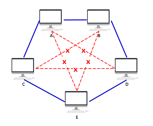 随着越来越多的人加入,你发现身上开的网口实在太多了,而且网线密密麻麻,混乱不堪。(而实际上一台电脑根本开不了这么多网口,所以这种连线只在理论上可行,所以连不上的我就用红色虚线表示了,就是这么严谨哈哈~)