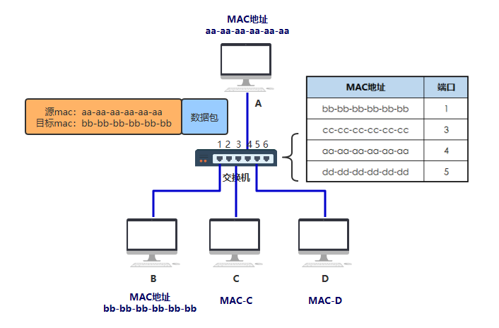 交换机内部维护一张 MAC 地址表,记录着每一个 MAC 地址的设备,连接在其哪一个端口上。