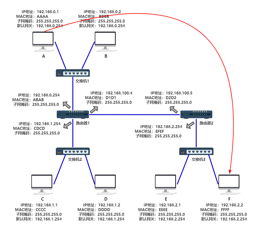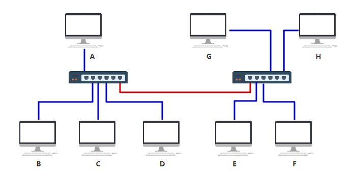 你完全不需要设计额外的东西,只需要按照之前的设计和规矩来,按照上述的接线方式即可完成所有电脑的互联,所以交换机设计的这种规则,真的很巧妙。你想想看为什么(比如 A 要发数据给 F)。