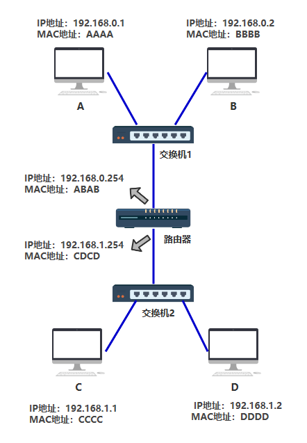 假如 A 给 B 发送数据,由于它们直接连着交换机,所以 A 直接发出如下数据包即可,其实网络层没有体现出作用。