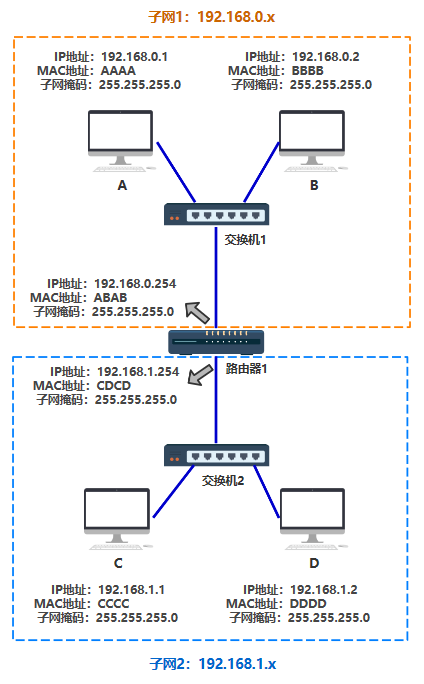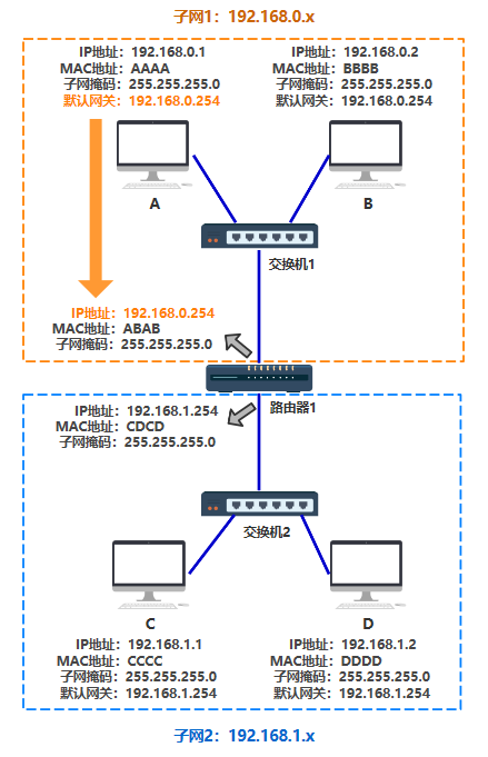 如上图所示,假如我想要发送数据包给 ABCD 其中一台设备,不论哪一台,我都可以这样描述,"将 IP 地址为 192.168.0 开头的全部发送给到路由器,之后再怎么转发,交给它!",巧妙吧。