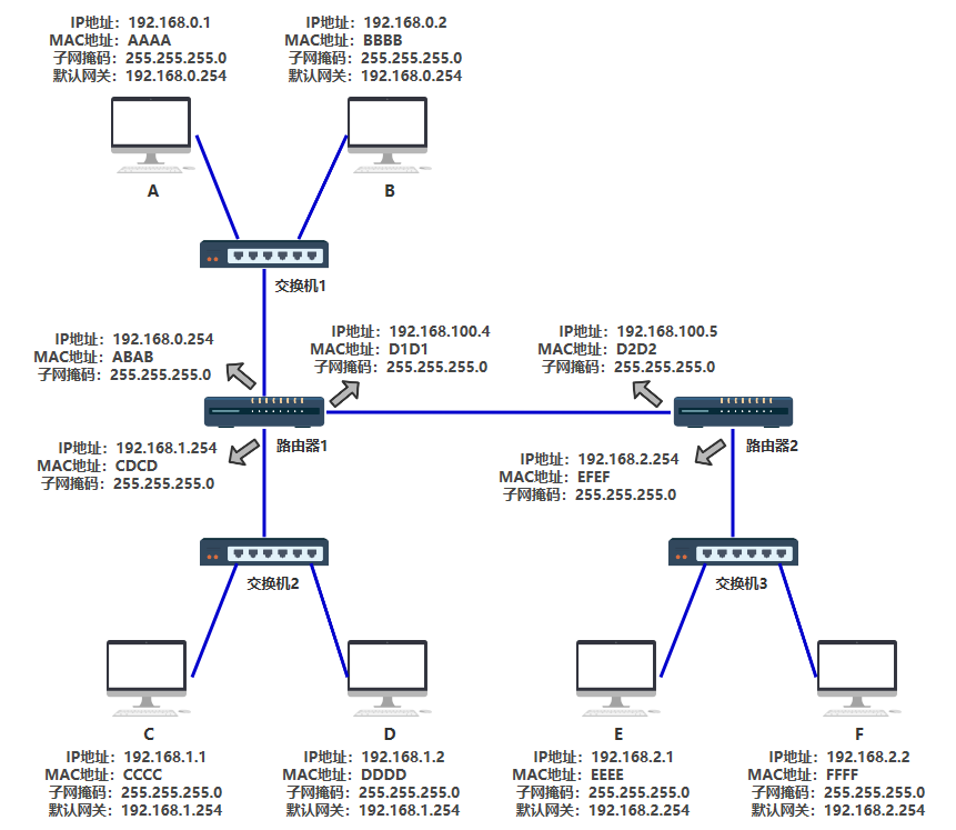 我们先给上面的组网方式中的每一台设备,加上自己的 IP 地址