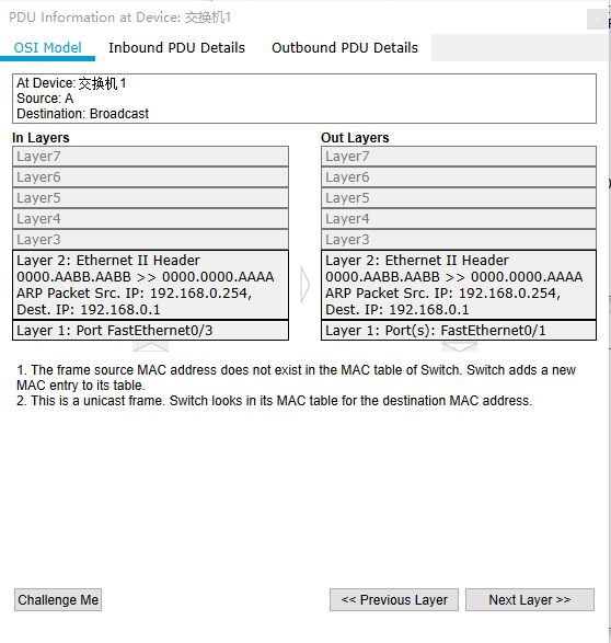 好了,现在交换机的 MAC 地址表中,只需要多出一条 MAC 地址 ABAB 与其端口的映射关系,就可以成功把数据包转交给路由器了,这条搞定。